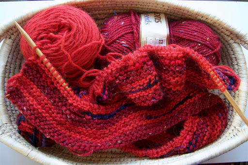 Here’s some of what I knitted today. I was in danger of becoming a complete Red Scarf Failure. I was about to let Norma down. How could it be January 7th already, and time to mail the scarves? What was I going to do? I’d frogged my first one, which was a failure because it wasn’t nearly long enough, but I hadn’t decided what to do about it.