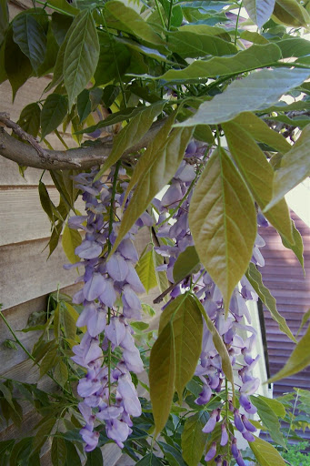 I love the leaves as they are now, so glossy and new. The big vines climbing up my staircase will give me a feeling of living in a wisteria room when they finish blooming and leafing. There’s a a nice new screen on the door this year, so when I open it the house is filled with wisteria perfume and the buzz of fat bumblebees.
