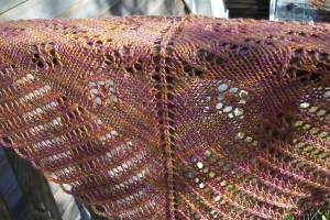 The yarn is beautiful worsted weight silk/merino dyed by Jen Heverly of Spirit Trail Fiberworks. I used just one 200-yard skein, less than the pattern suggests, because I was working with a very different type of yarn than Shelia used in her design. The finished shawl is a bit smaller than the original, which is just right for me.The fabric I was getting was perfect on US 9’s so I didn’t want to go up a needle size just to make it bigger.