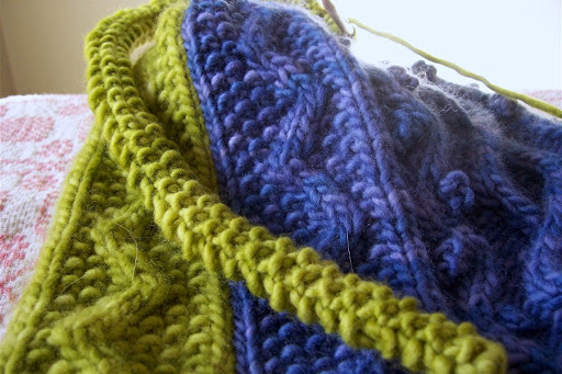 I’ve been doing a little knitting! This is the Cabled Tea Cozy from The Knitter’s Book of Yarn. I finished one side a few weeks ago, but I had to wait for my Malabrigo order to arrive before I could start the second side and keep going. The green is Lettuce, and the blue is Indigo. I like the way they go together.