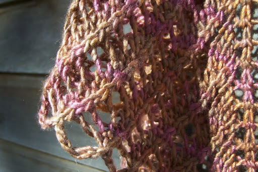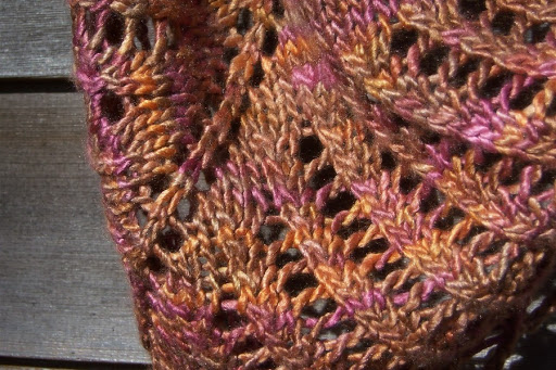 The yarn is beautiful worsted weight silk/merino dyed by Jen Heverly of Spirit Trail Fiberworks. I used just one 200-yard skein, less than the pattern suggests, because I was working with a very different type of yarn than Shelia used in her design. The finished shawl is a bit smaller than the original, which is just right for me.The fabric I was getting was perfect on US 9’s so I didn’t want to go up a needle size just to make it bigger.