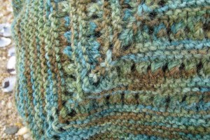 I started a simple New Beginnings project this year, since last year was the first time I didn’t finish what I started on Sunday morning. It was a lace scarf with a provisional cast-on and charts, and apparently, not meant to be. So this time I brought out a skein of merino-alpaca, a beautiful limited edition yarn from Chris at Briar Rose Fibers in greens and blues and browns. I cast on a few stitches on US 10 needles, and began Clara’s One Skein Shawl from Knitter’s Review. I added some lacey rows, but it’s mostly garter stitch, so it’s chunky and warm, and above all, easy.