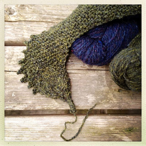 The pattern is Zephyr Cove by Romi Hill, part of the “Home is Where the Heart Is” collection of small shawls. I wanted to use the same colors she used in the sample — green and blue — so I went into my stash and came up with several possibilities. None of the combinations seemed to be what I wanted, until this: one of my favorite yarns, Brooklyn Tweed LOFT. The green is “Artifact” and the blue is “Old World.”