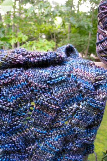 After a few false starts and lots of grumbling, I settled on a pattern for my KBOW Woolalong project for this month. The August fiber is Shetland, so I ordered some DK Organic Shetland from Garthenor. I was a little impulsive about my choice, so I had a hard time finding a project that suited the yarn — I’ll admit it, I was really cranky for a while on Thursday — but in the end I decided on Nora Gaughan’s Here and There Scarf from Scarf Style (please excuse the cloudy day photo). So far, so good!