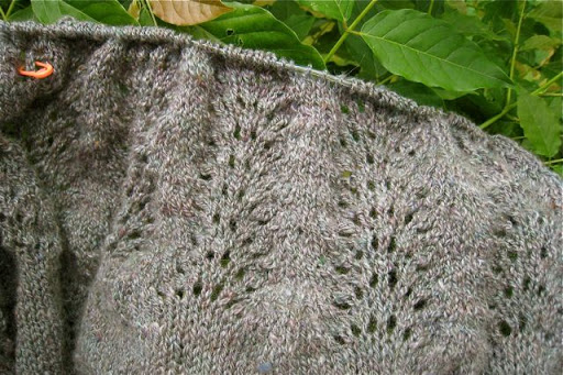 I’ve been trying to maintain at least a little of my knitting mojo in these weeks. This is my version of Evelyn Clark’s Old Shale Shawl, which was first published in the Jan/Feb 2005 Piecework Magazine. I’m knitting with my own handspun — it’s that blend of BFL, cashmere, silk, and merino from Spirit Trail Fiberworks. I decided to knit the shawl in stockinette rather than garter stitch, because this pretty yarn deserves to show off. I’m also leaving out the traditional garter ridges in the classic stitch. I think of this as Feather Without the Fan.