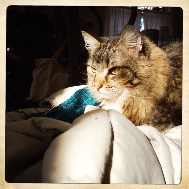 Rosemary appropriated it when the sunbeam arrived. I can’t blame her, since it wasn’t going to last long. She loves her green blanket thing, especially when it’s warmed by the sun or by my lap underneath it. At night, she likes to burrow under it and go to sleep. So what if Jane’s knitting was in her way?